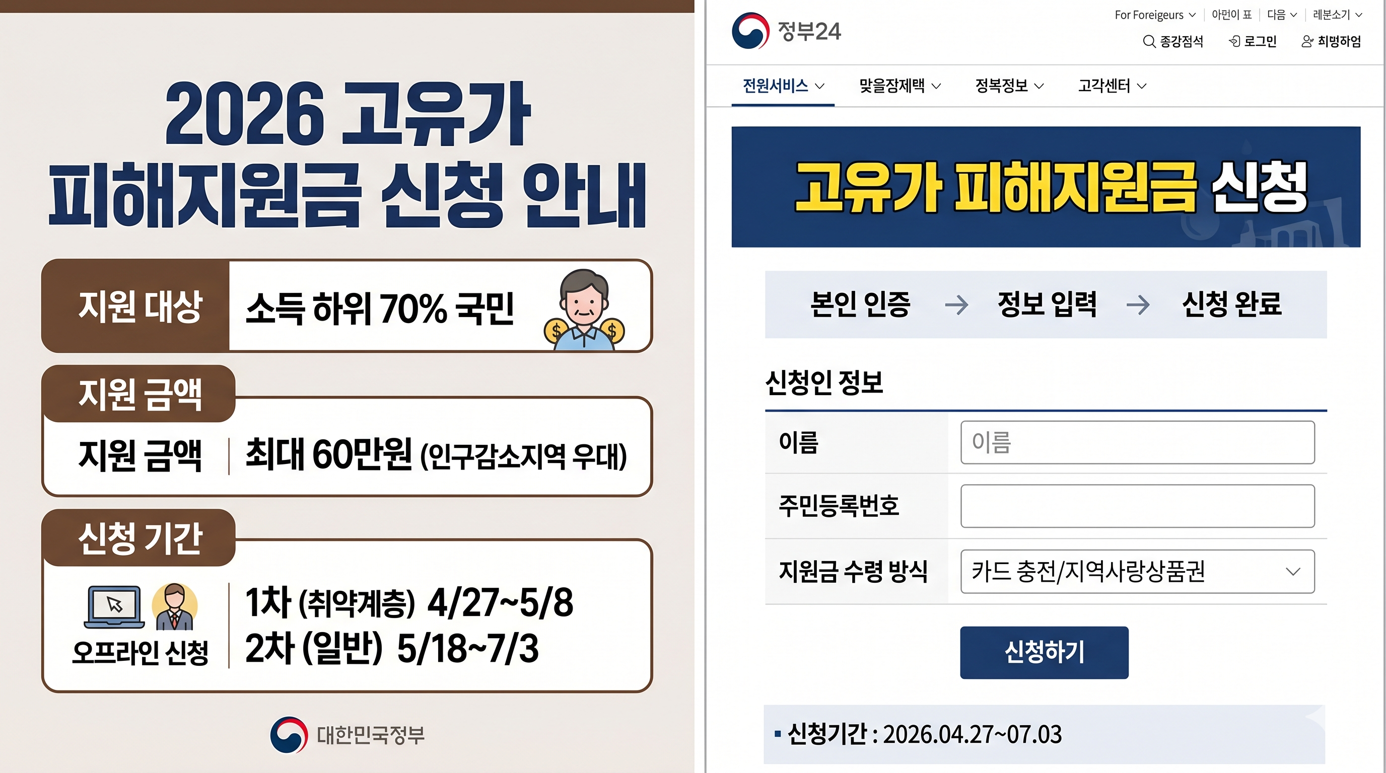 중동 분쟁발 고유가로 힘드시죠? 정부에서 지원하는 피해지원금 신청이 오늘(4월 27일)부터 시작되었습니다. 대상자라면 놓치지 말고 지금 바로 신청하세요!