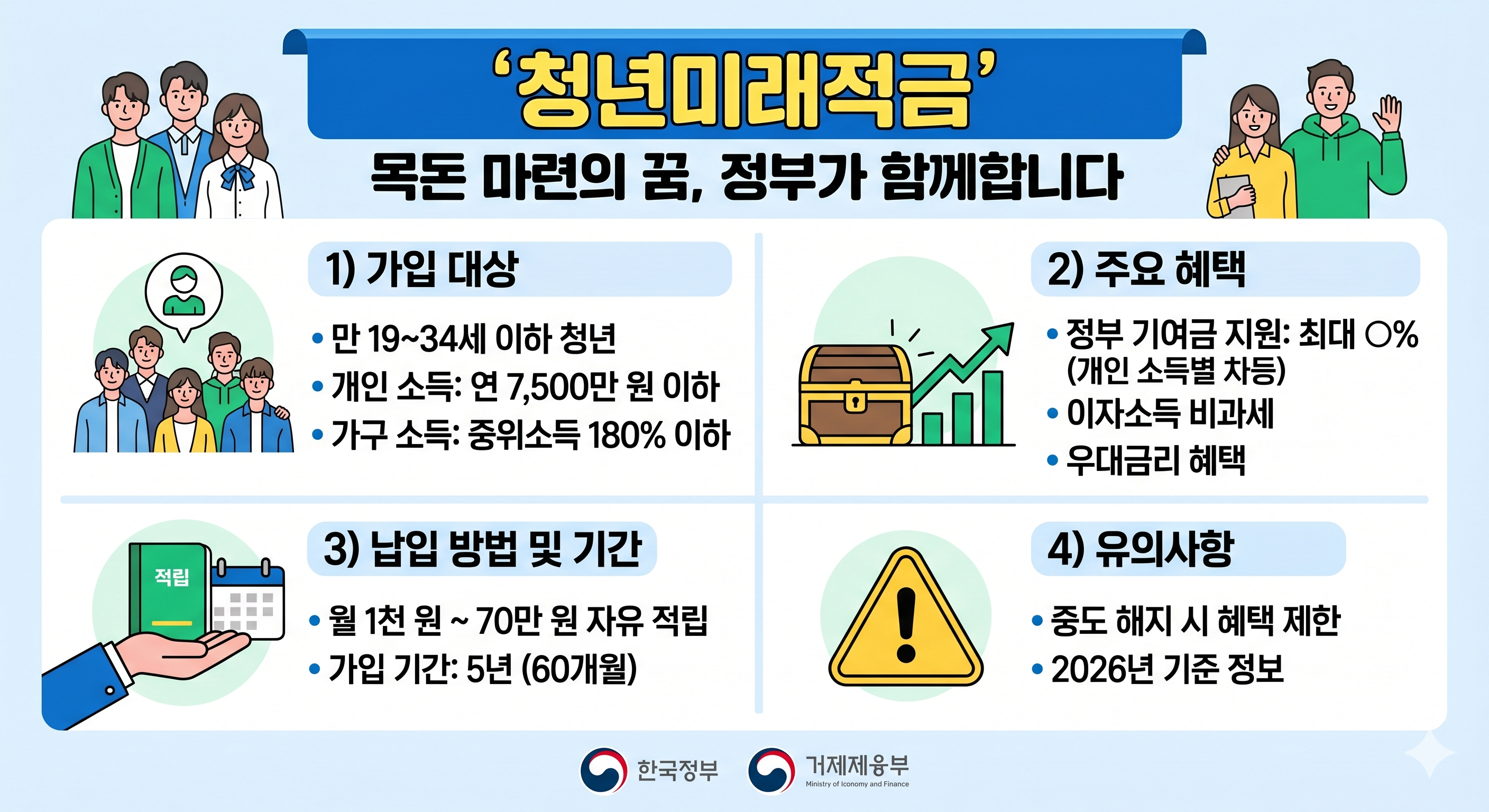 정부 지원금과 높은 이자율로 청년들의 목돈 마련을 돕는 청년미래적금! 오늘은 가입 조건부터 신청 방법, 그리고 놓치면 안 되는 꿀팁까지 한눈에 정리해 드립니다.