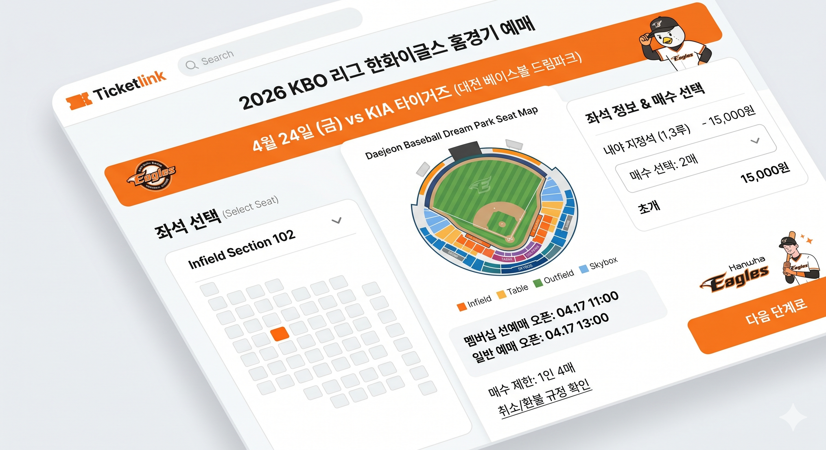 한화 이글스의 홈 경기 티켓은 공식 파트너사인 티켓링크(Ticketlink)를 통해 단독 판매됩니다. 인기 경기는 '피켓팅'이 치열하니 미리 준비하는 것이 좋습니다.